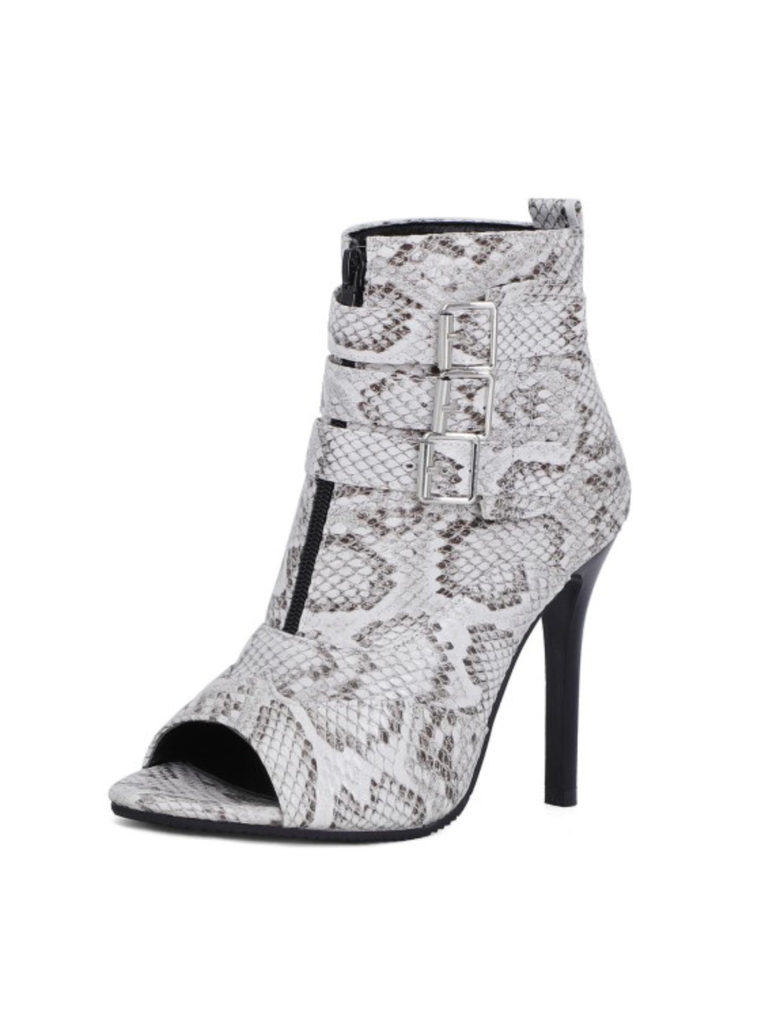 Style: Peep-Toe Ankle Boot Sandals Material: Faux Leather Closure Type: Front Zipper with Buckle...