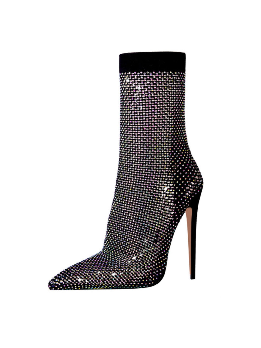 Sparkly Rhinestone Stiletto Sock Boots Sandals for Women in Black