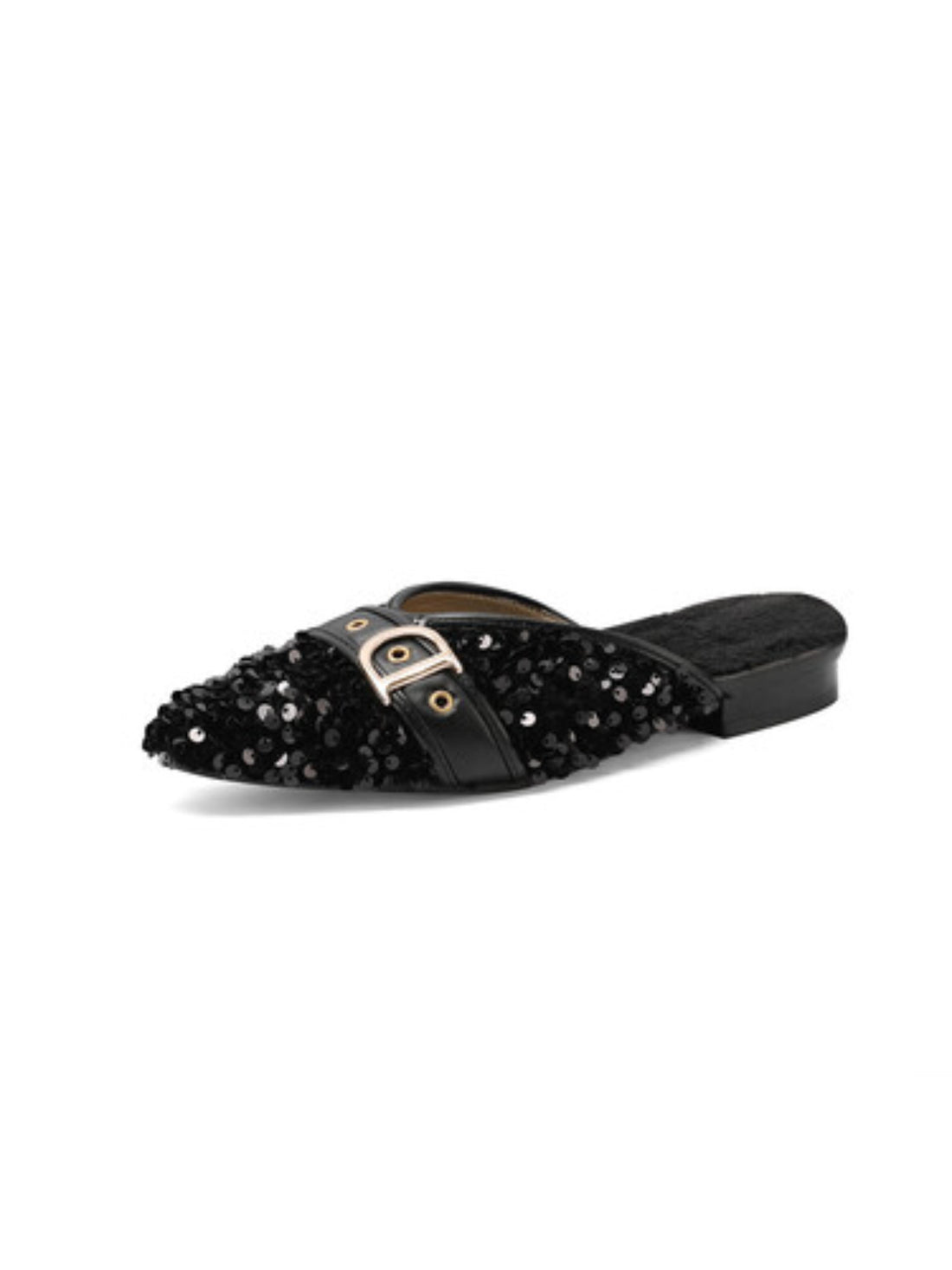 Style: Slip-On Mules Sandals Material: Sequin Closure Type: Slip-On Heel Type: Flat Color: Black...