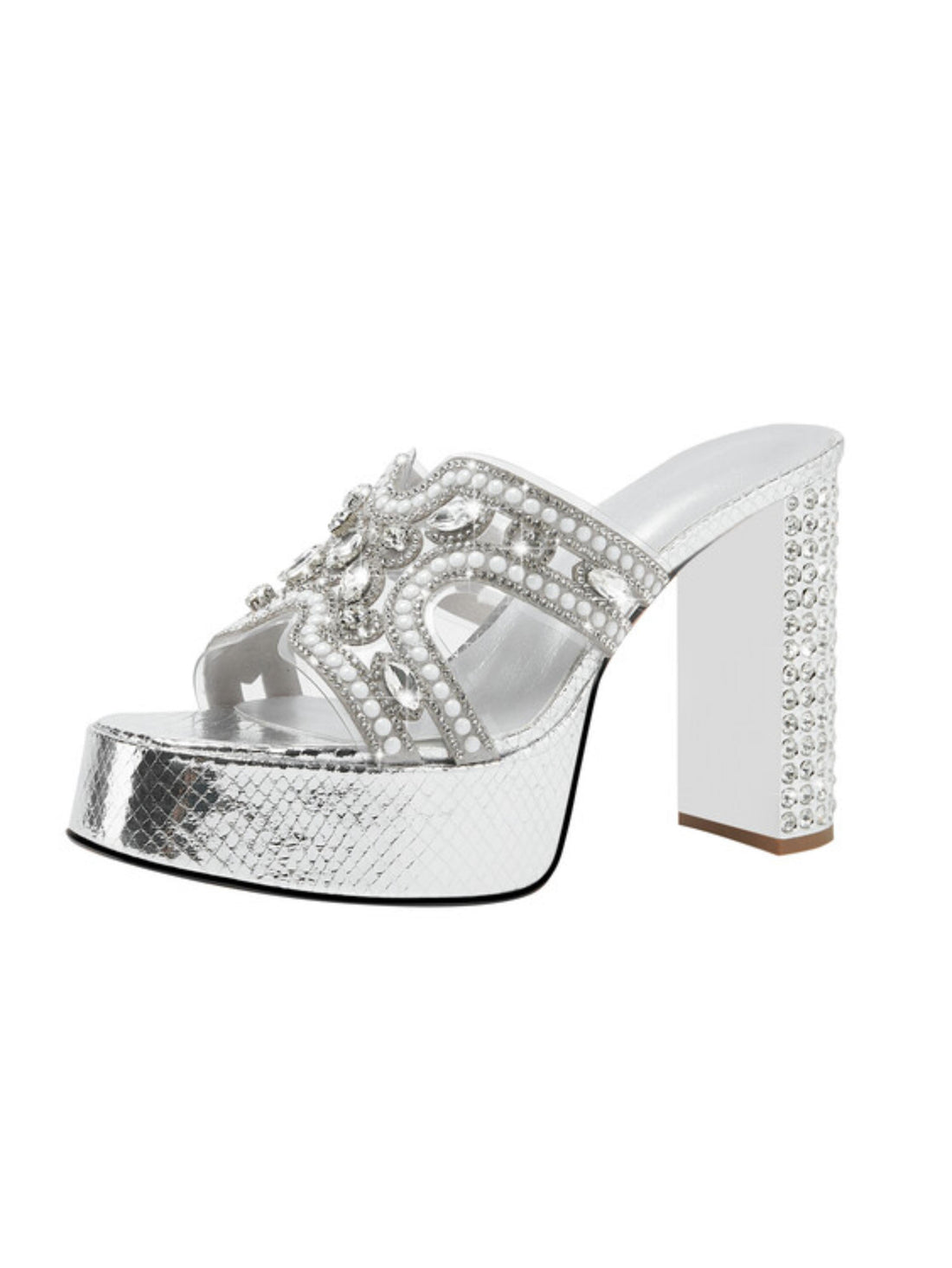 Pearl Accents Block Heel Platform Silver Sandals for Women