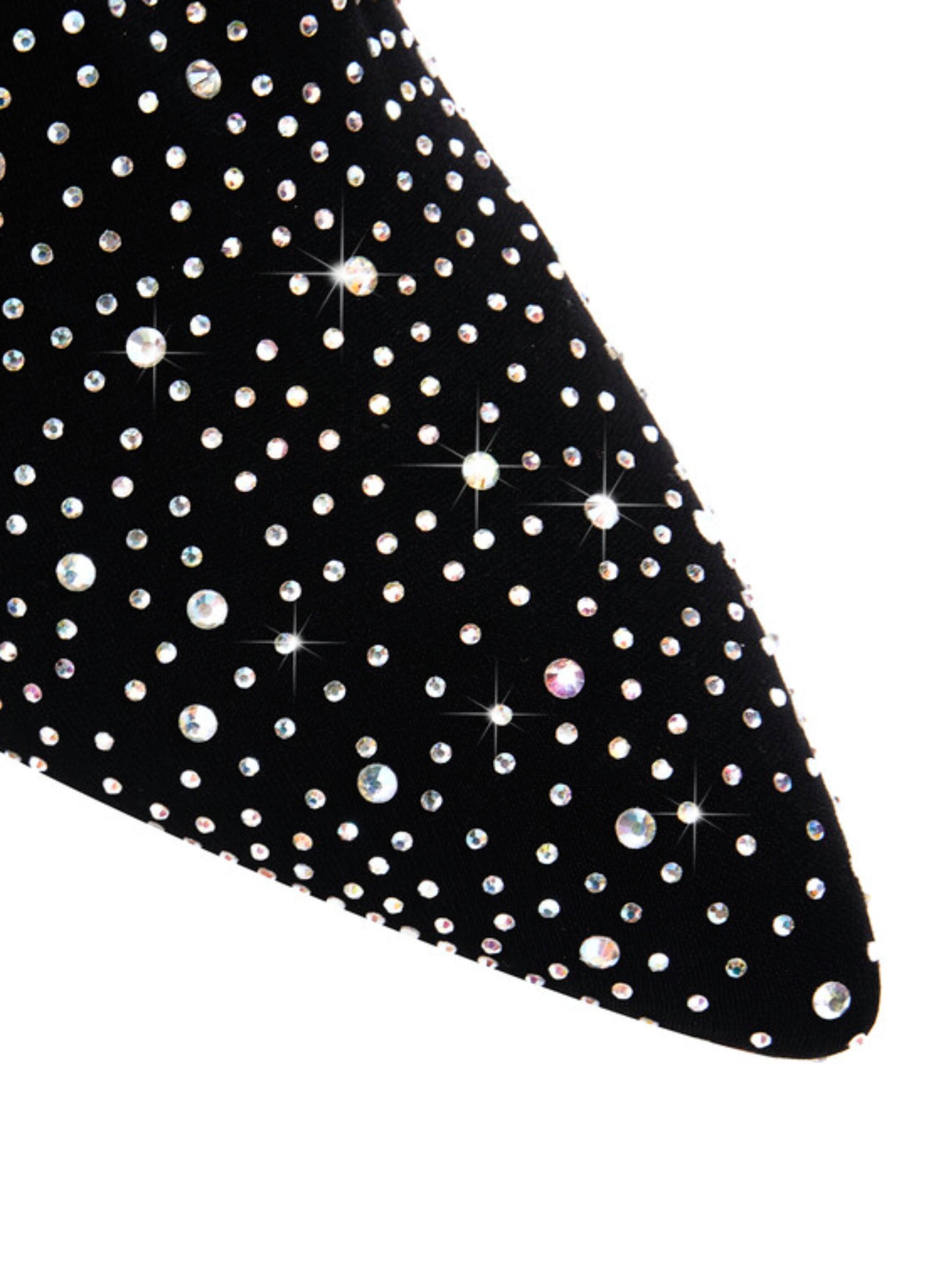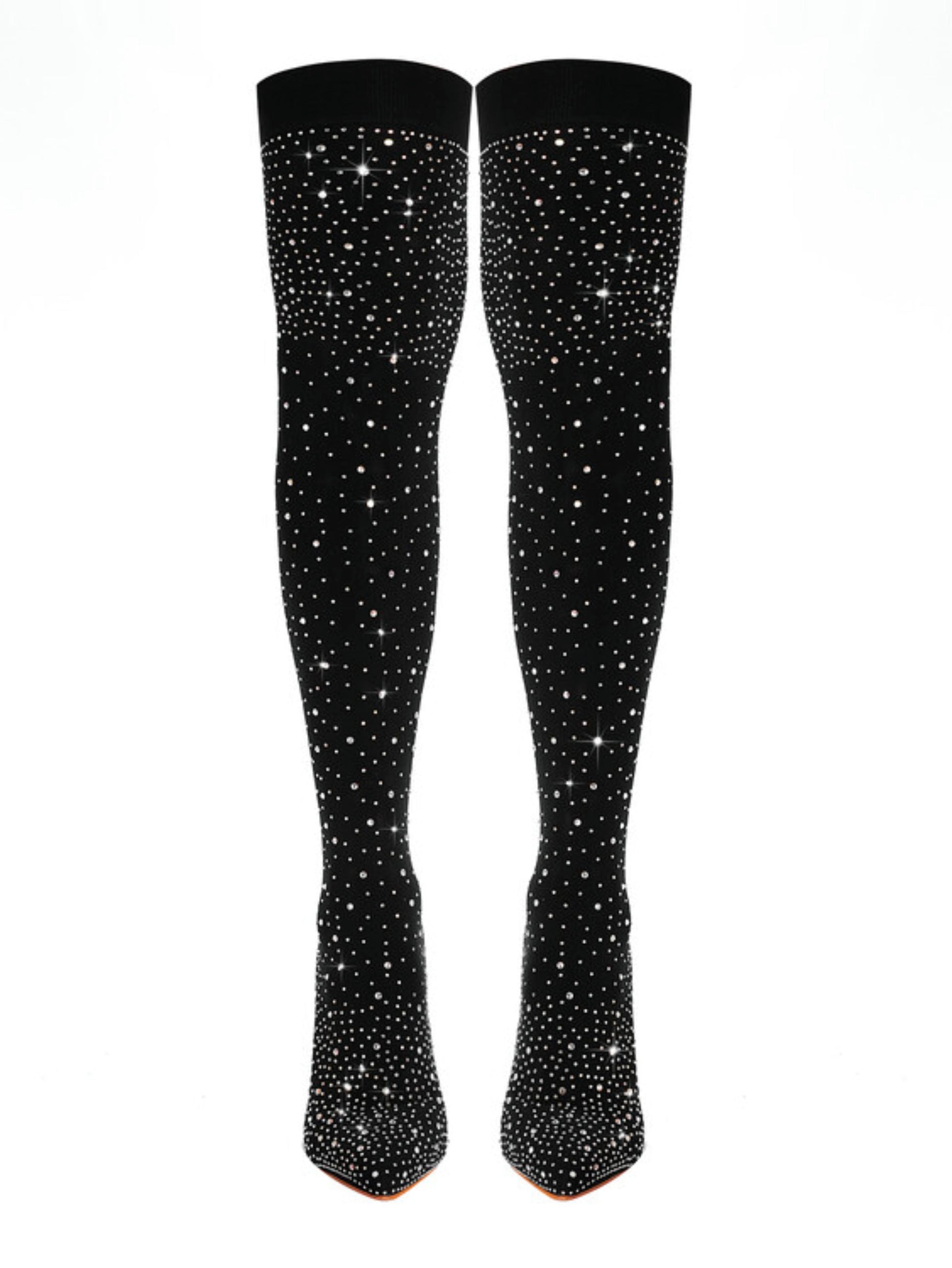 - Sandal Features: All-over rhinestone embellishments for a dazzling sparkle effect, over-the-knee length for a bold, statement look, pointed toe design for an elegant shape, sleek stiletto heel for a glamorous lift, and pull-on style for easy wear