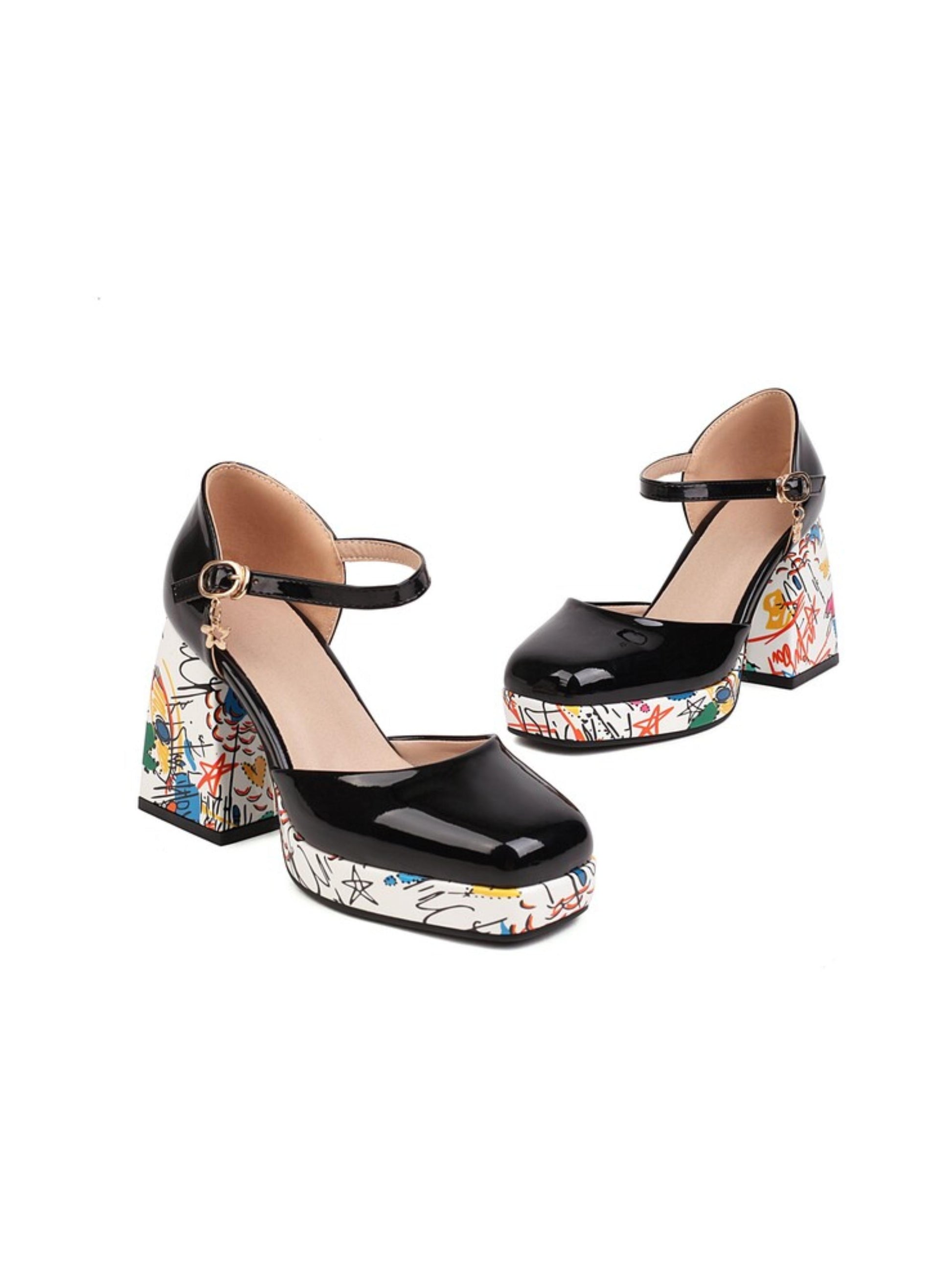 - Sandal Features: Ankle strap with buckle and charm, bold artistic heel and platform design, and sturdy block heel for added comfort