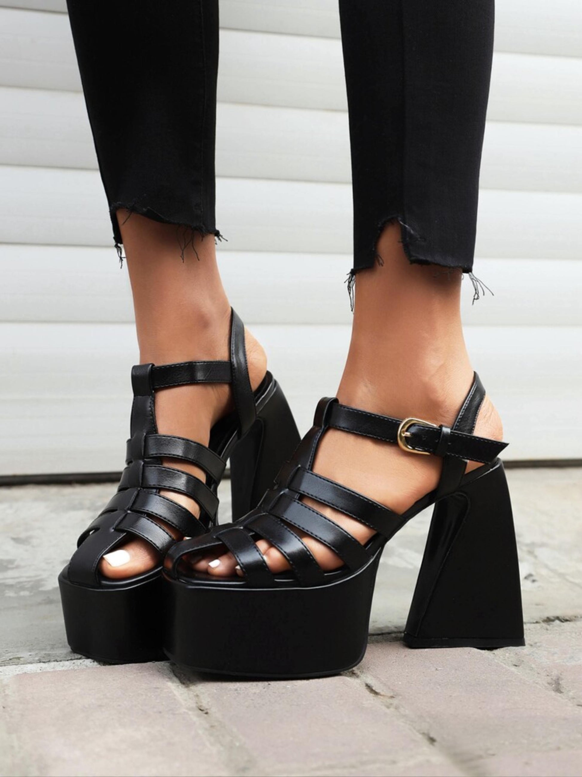 - Sandal Features: Secure cage-style straps for support, elevated chunky platform for added height & comfort balance, and adjustable ankle buckle strap