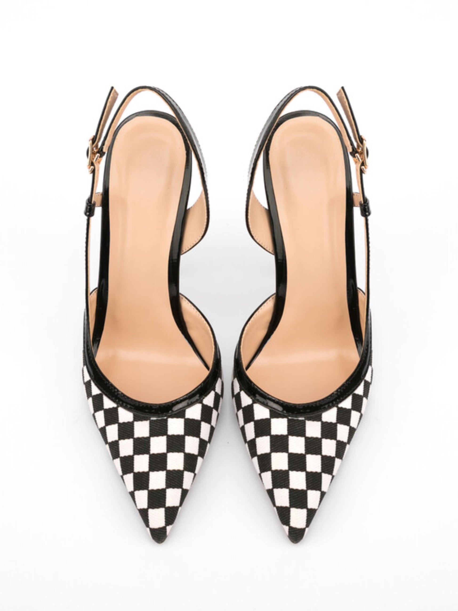 - Sandal Features: Pointed toe with bold latice fabric design, ultra-thin stiletto heel, and buckle strap closure for a secure and adjustable fit