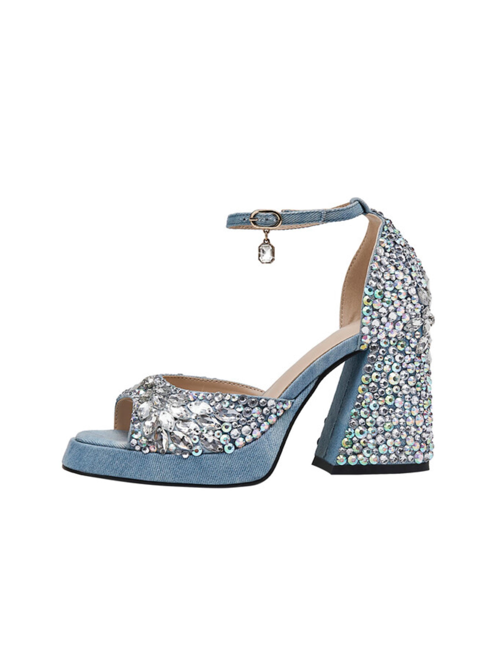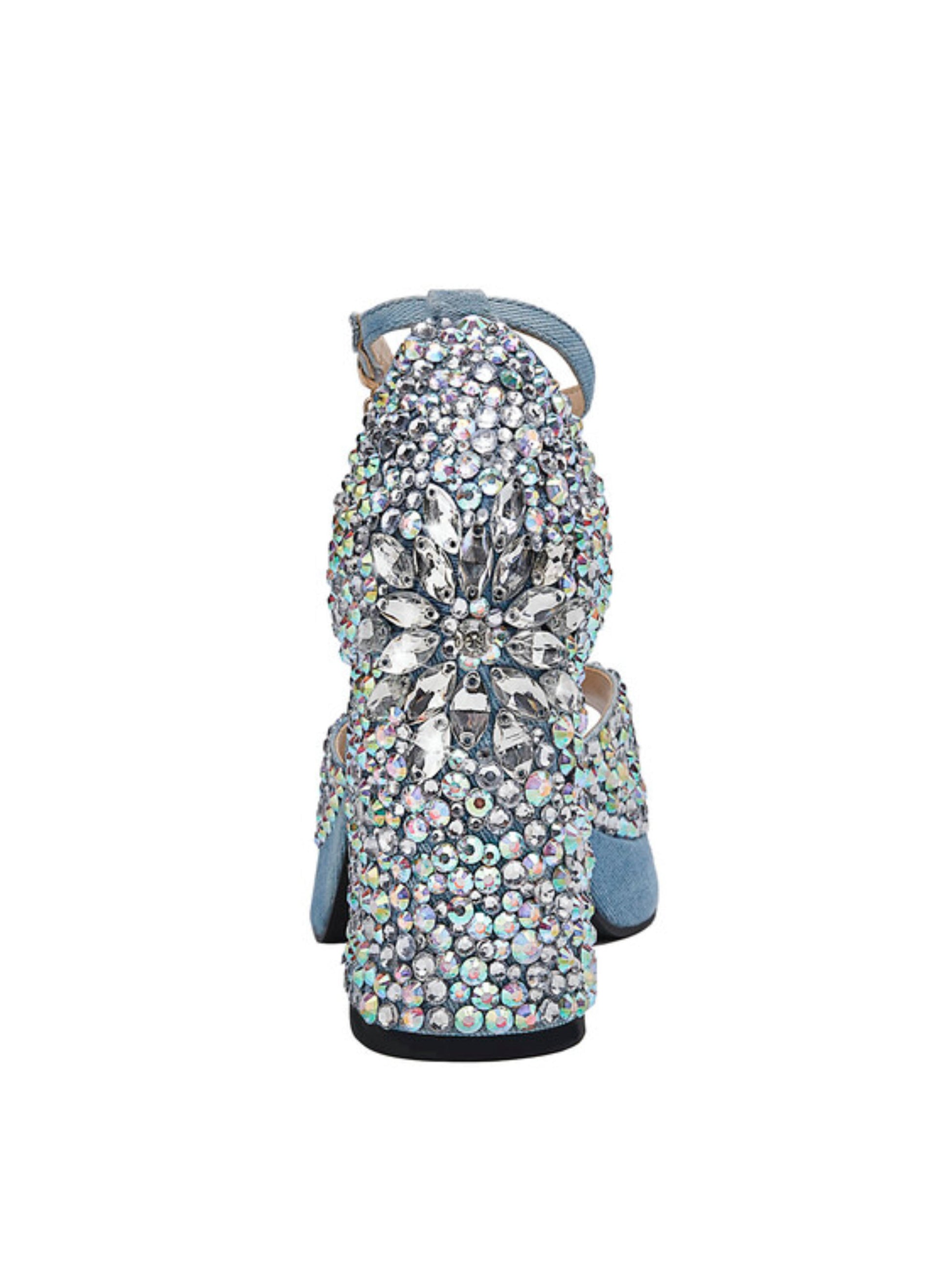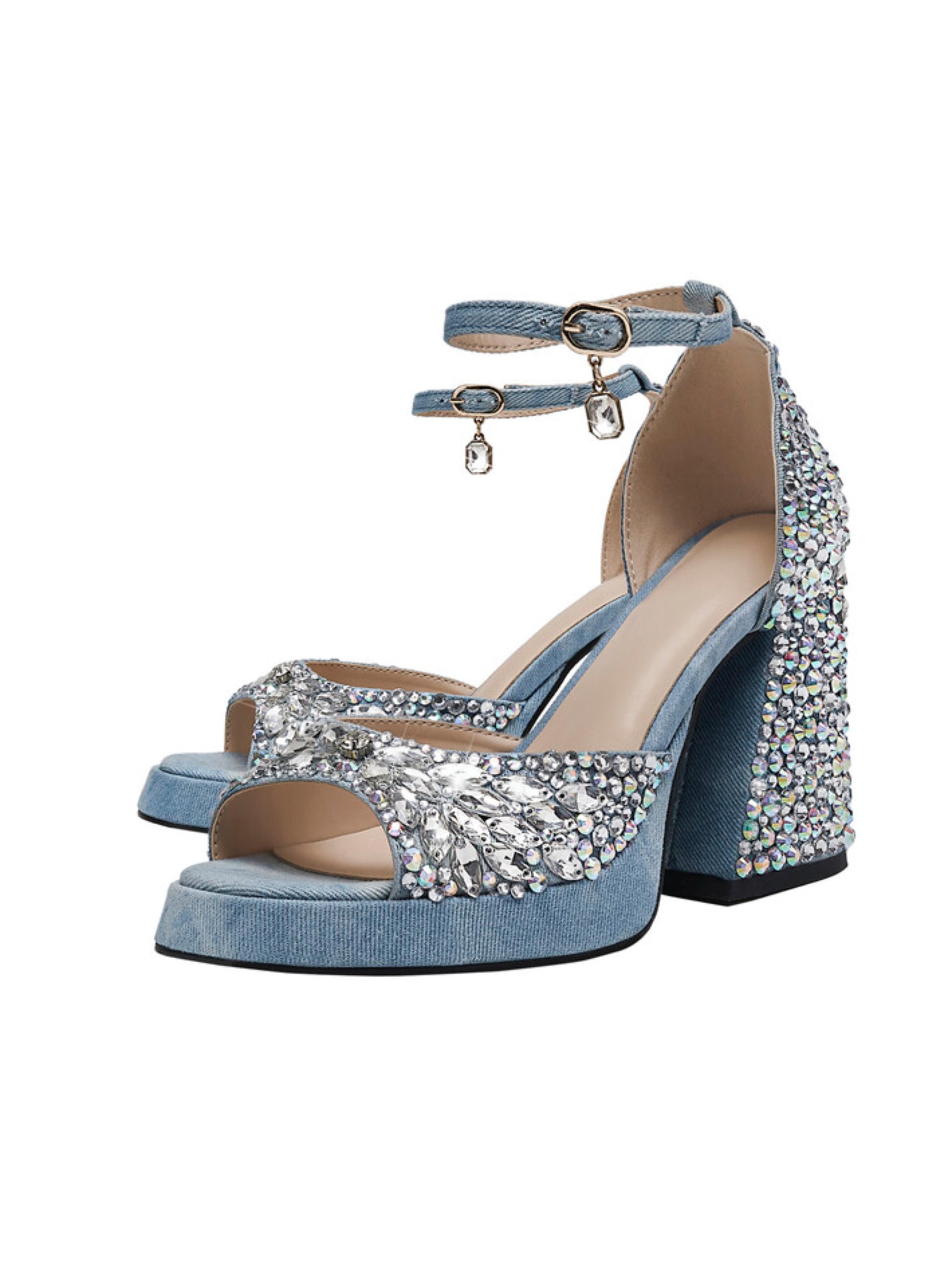- Sandal Features: Sparkling rhinestone embellishments on heel and upper, sturdy block heel for stability, cushioned insole for comfort, platform design for easier walking, and ankle strap with dangling charm detail