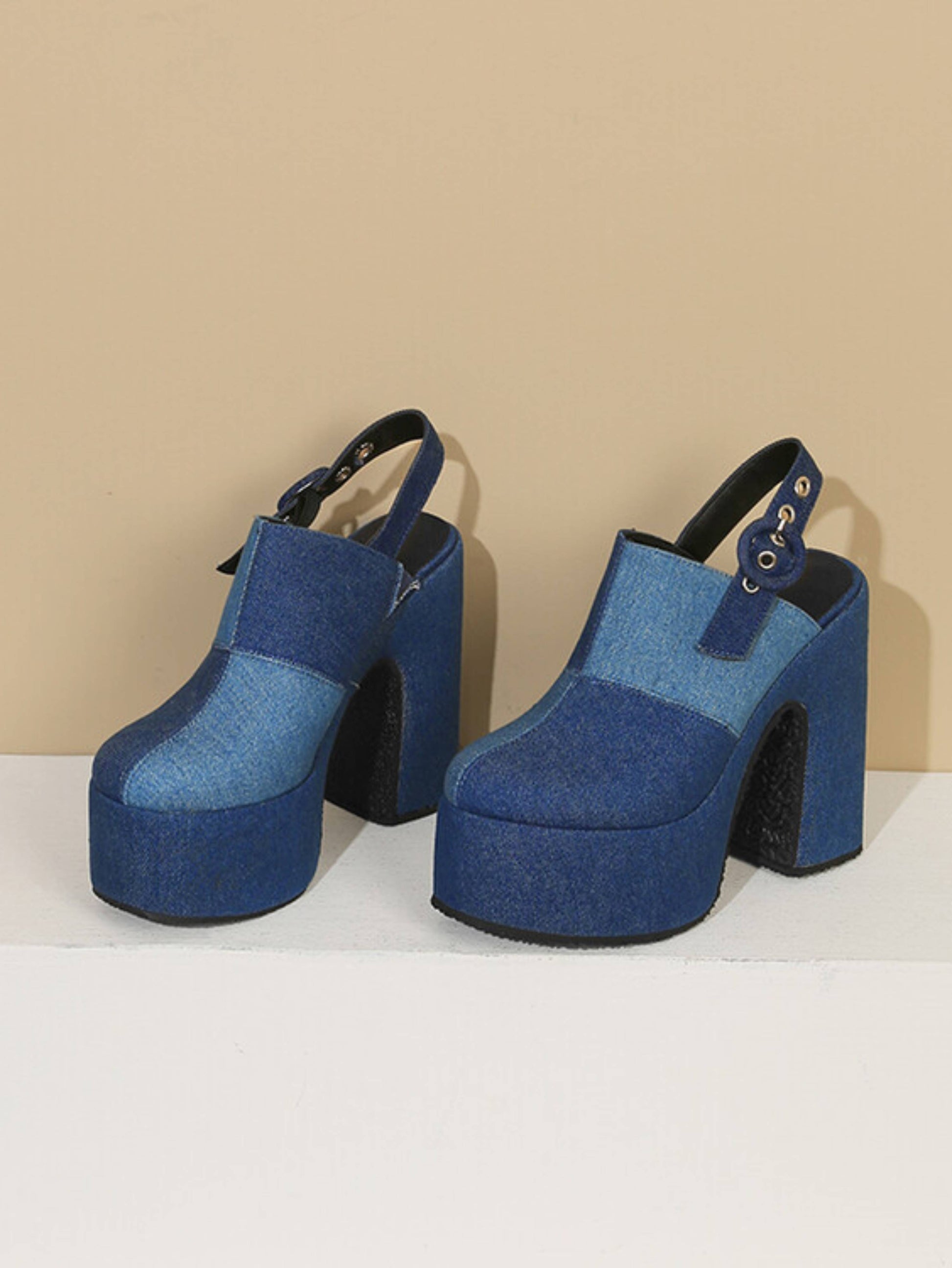 - Sandal Features: Patchwork denim design, retro chunky block heel, sturdy slingback with metal buckle, and bold platform for extra comfort