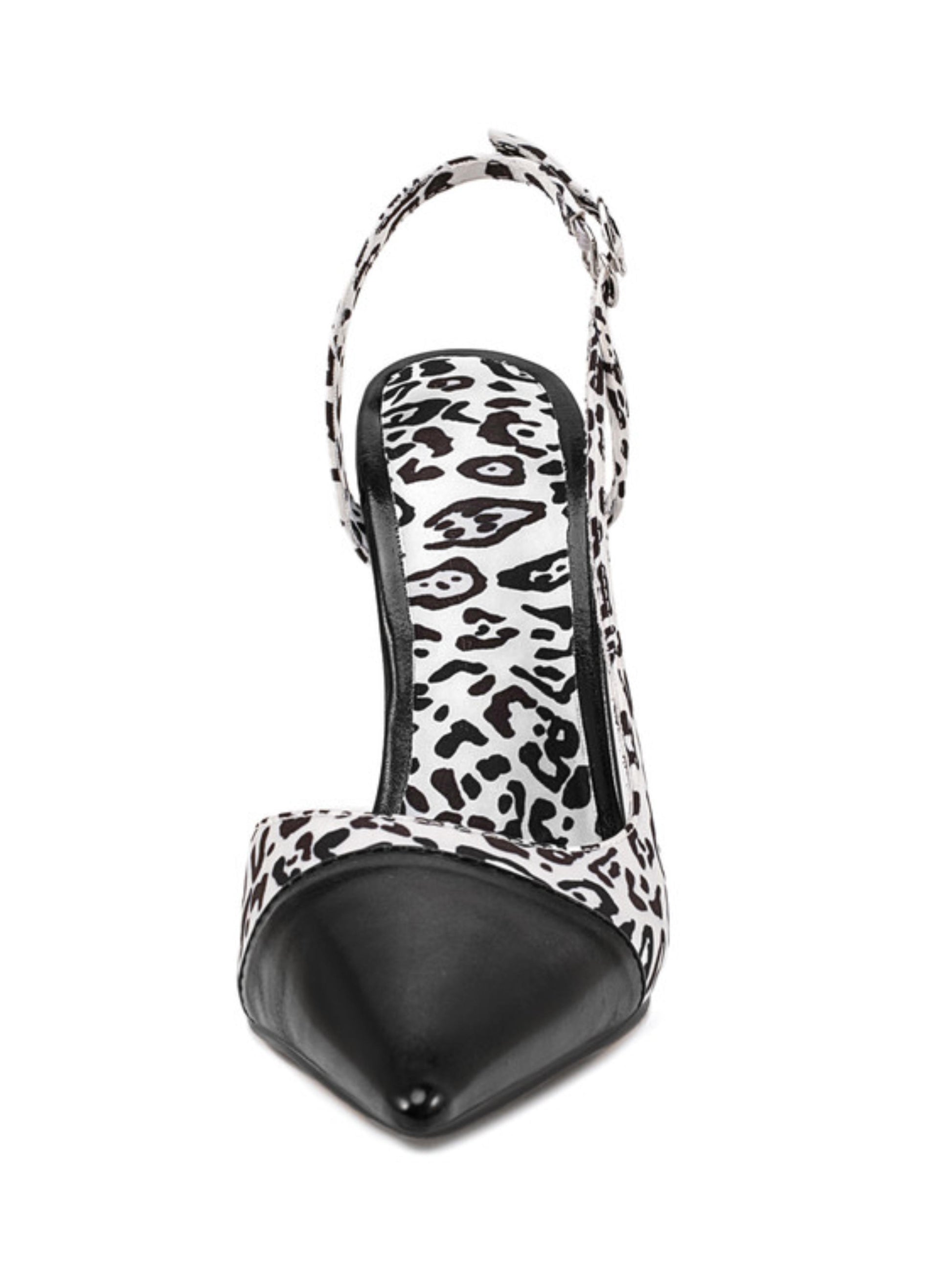 - Sandal Features: Glossy black toe cap for contrast and elegance, striking animal print upper for standout style, and slingback design with buckle for secure fit