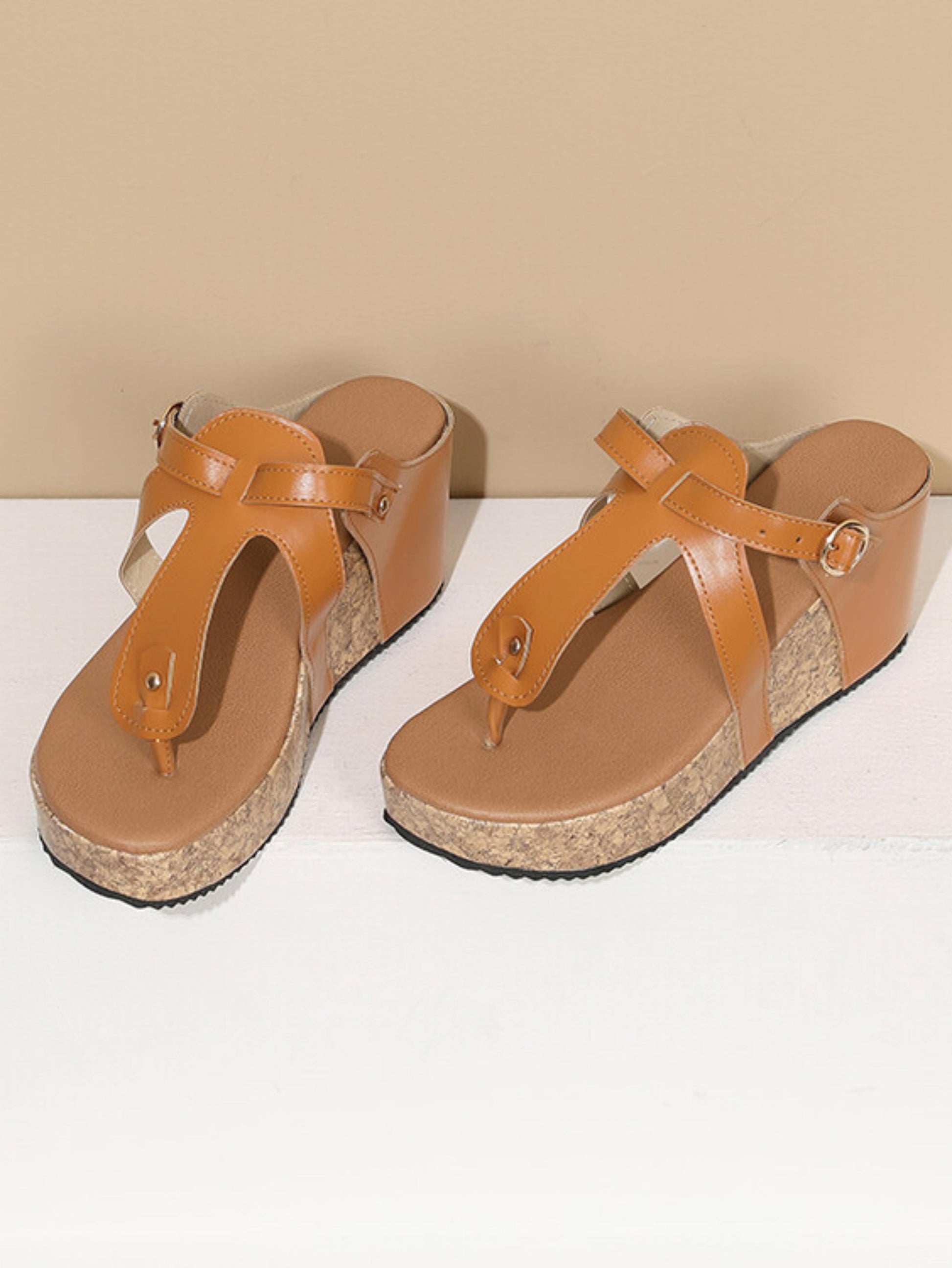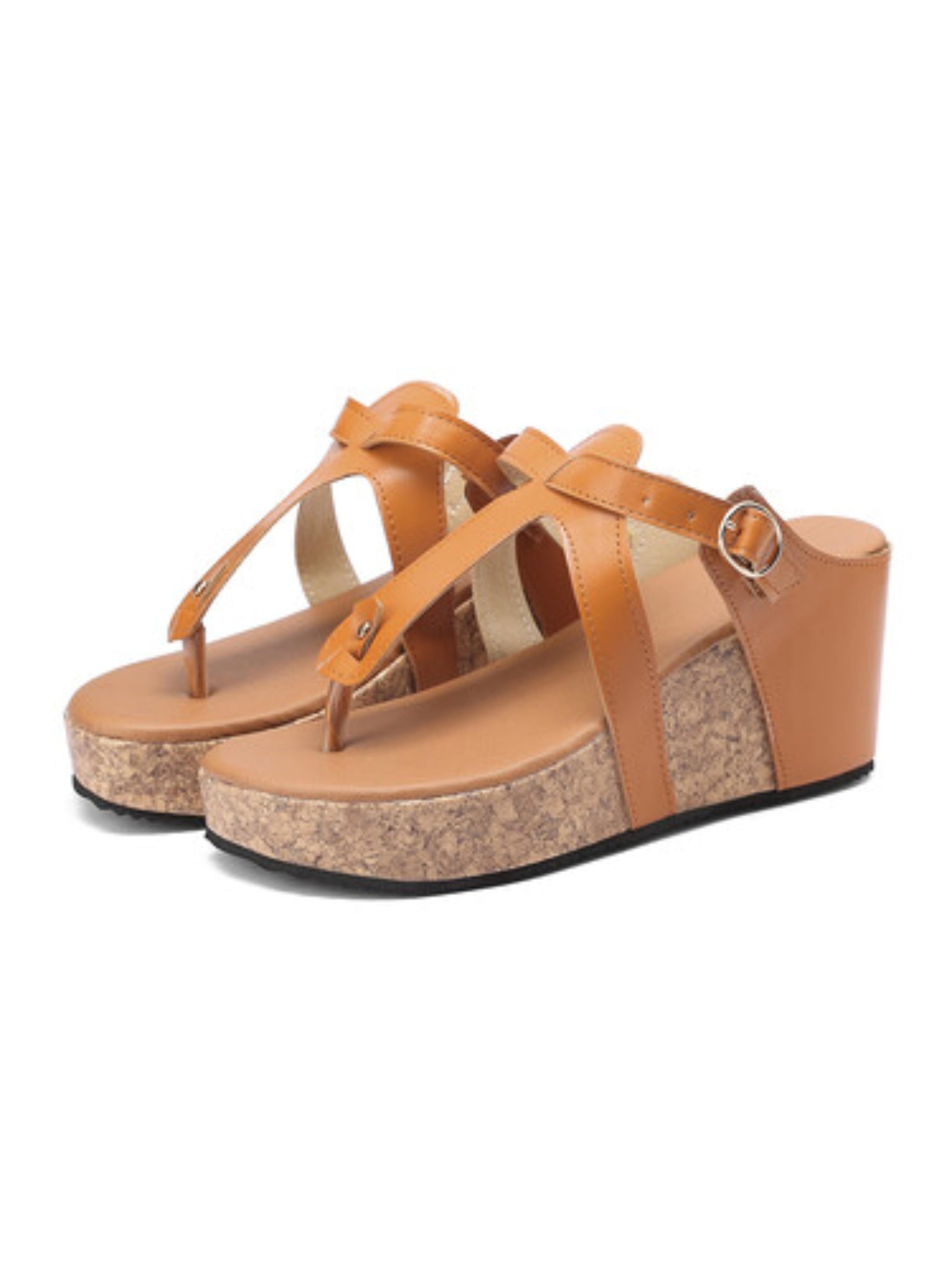 - Sandal Features: Slip-on with side buckle adjustment, cushioned insole for comfort, lightweight cork wedge for added height and stability