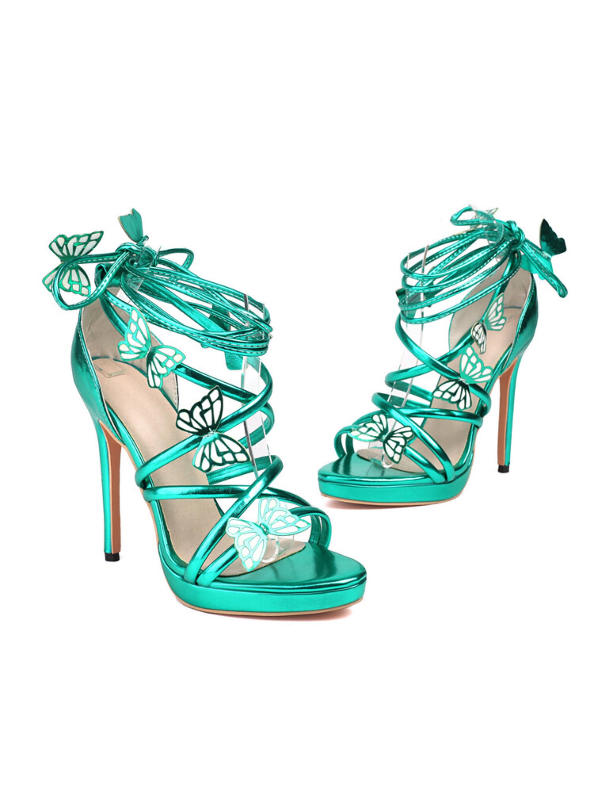 - Sandal Features: Green butterfly accents, strappy lace-up design wraps elegantly around the ankle and leg, and high stiletto heel