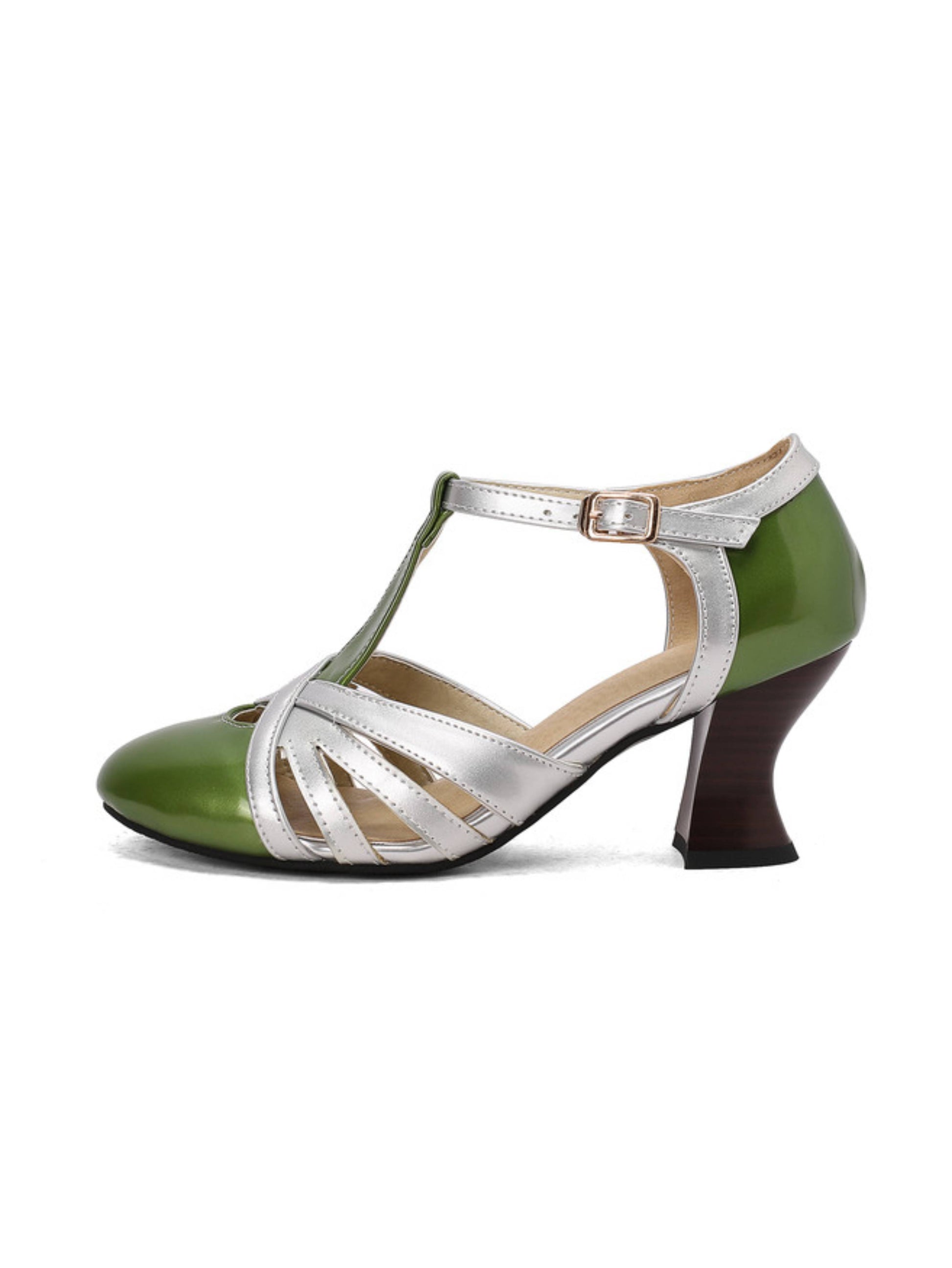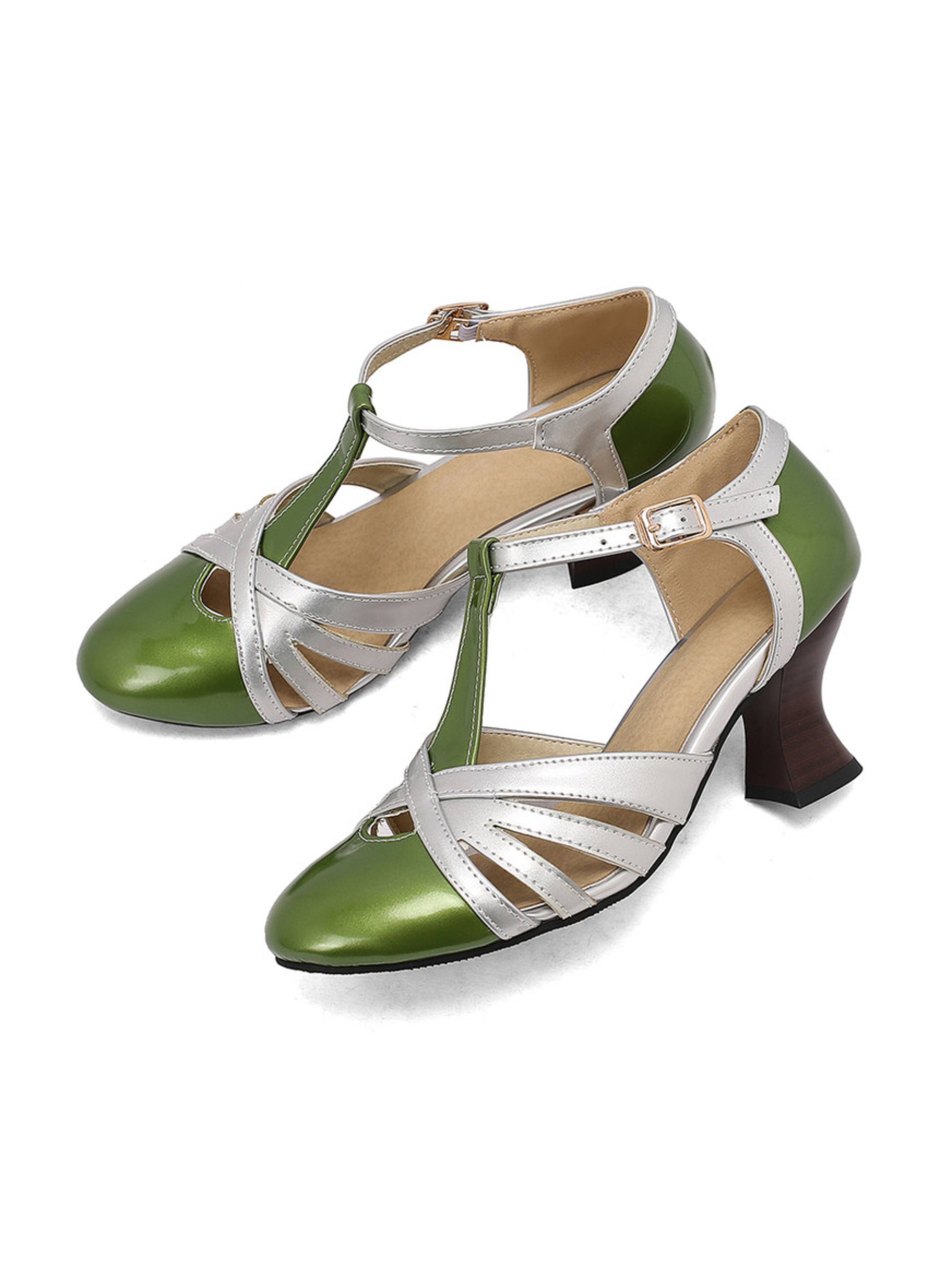 - Sandal Features: Elegant T-strap design, shiny green and silver color, secure buckle strap, and glossy patent finish