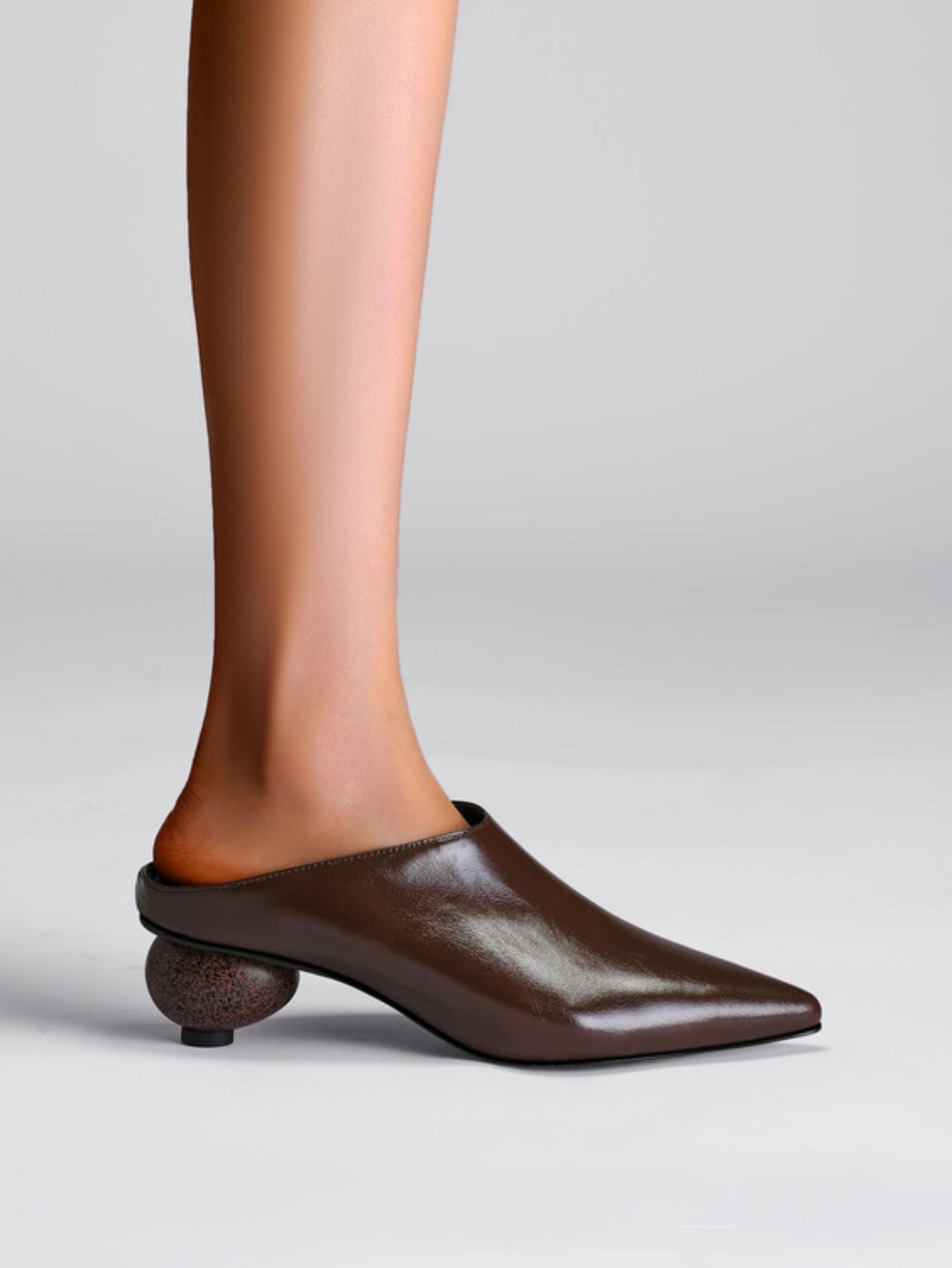 - Sandal Features: Fashion-forward sculptural heel design, Glossy finish, closed pointed toe for a sleek look, open back for easy wear