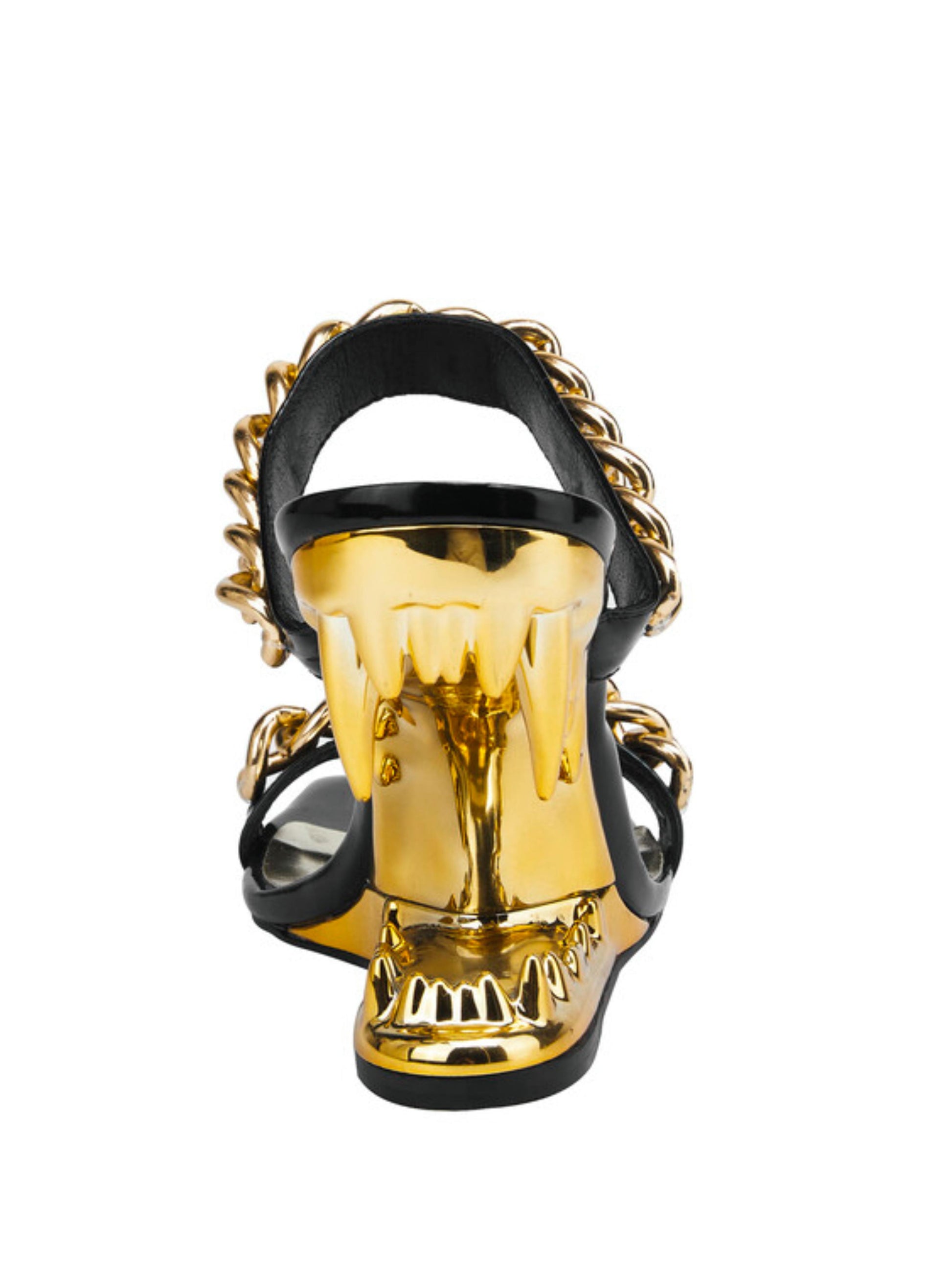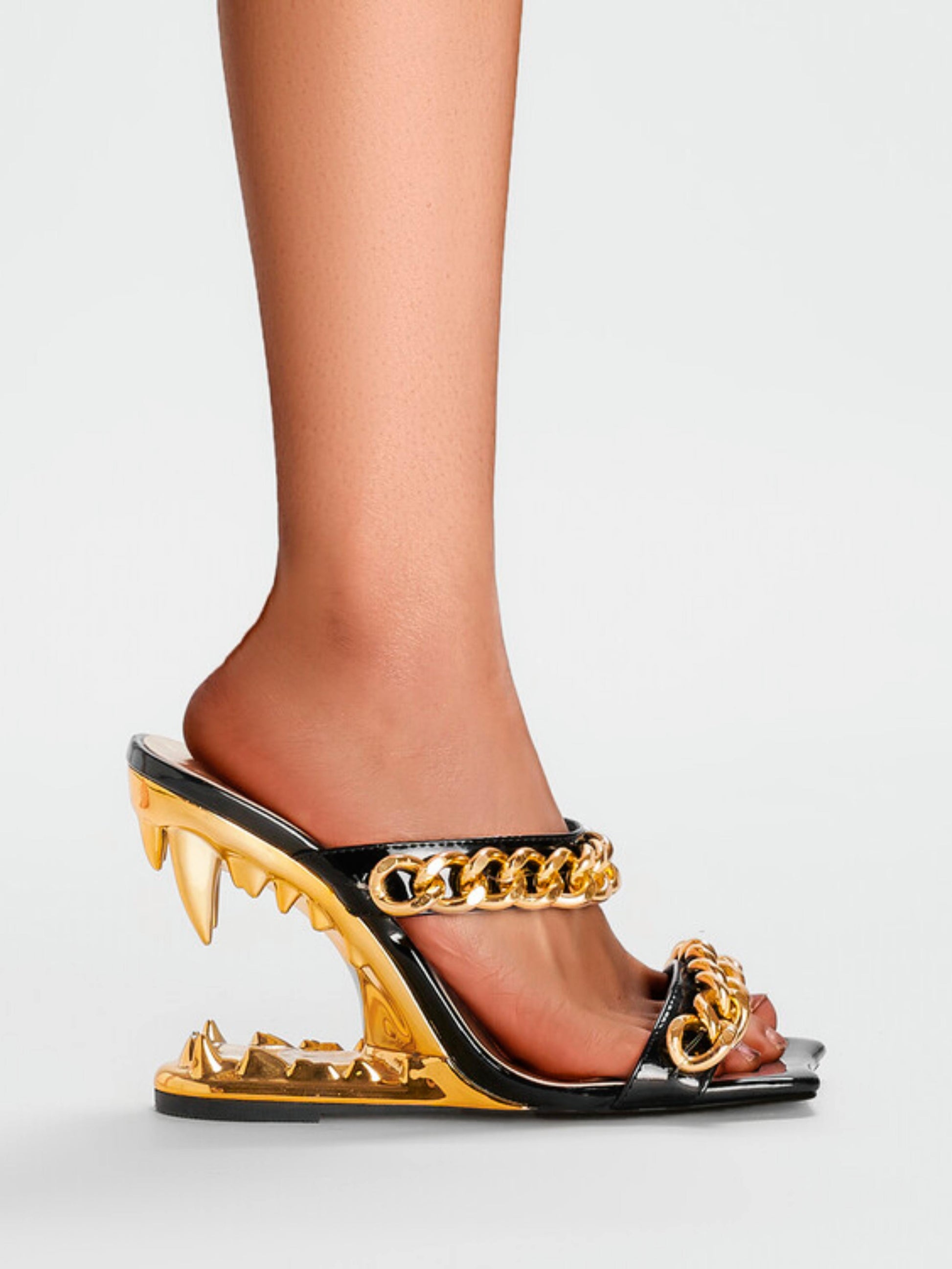 - Sandal Features: Bold gold chain straps, artistic sculpted heel design with fang-like spikes, glossy finish, and luxury statement piece perfect for runway or special occasions
