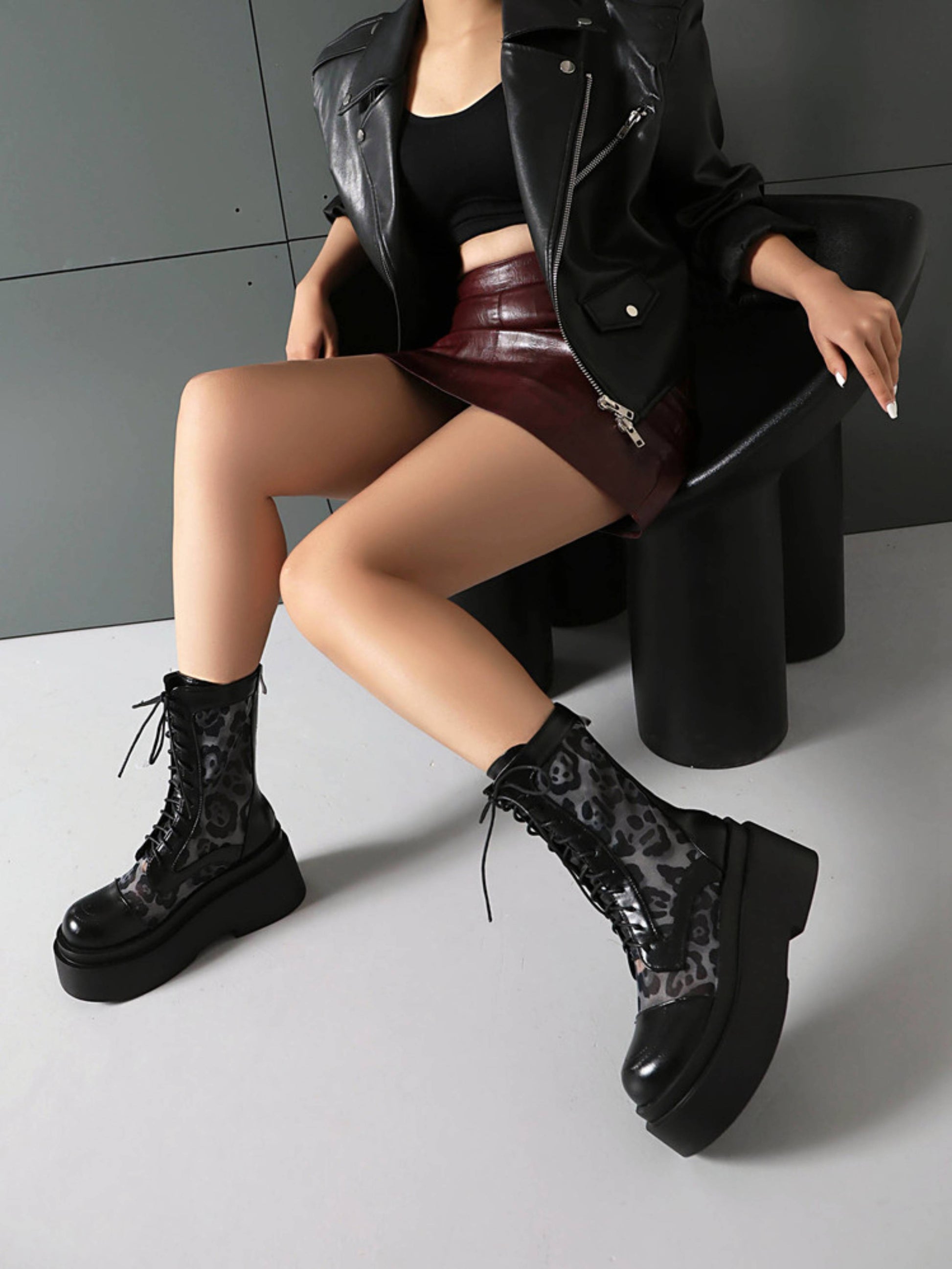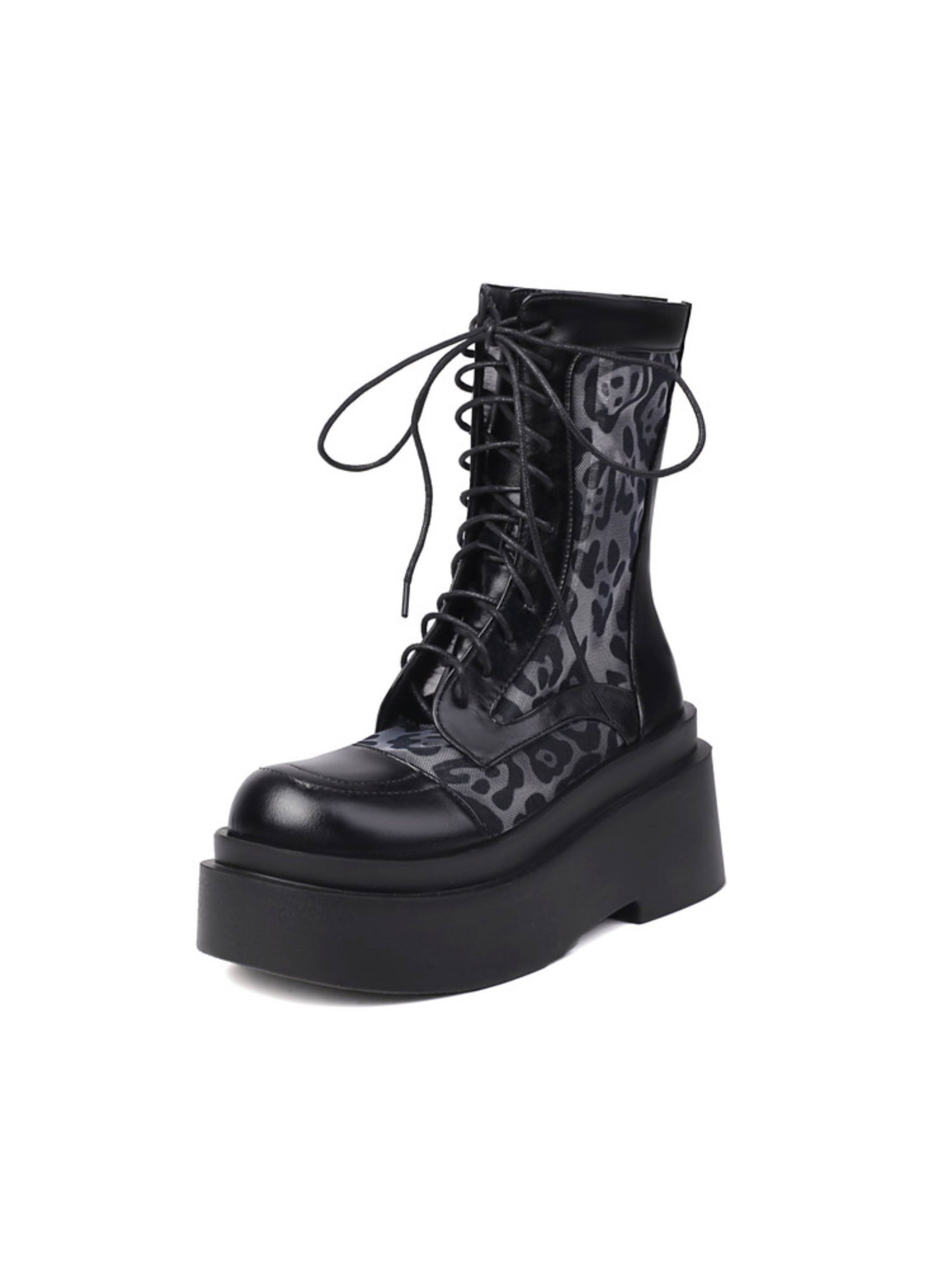 - Sandal Features: Edgy combat boot design, bold leopard print side panels, chunky platform sole for height and comfort, and lace-up front for adjustable fit