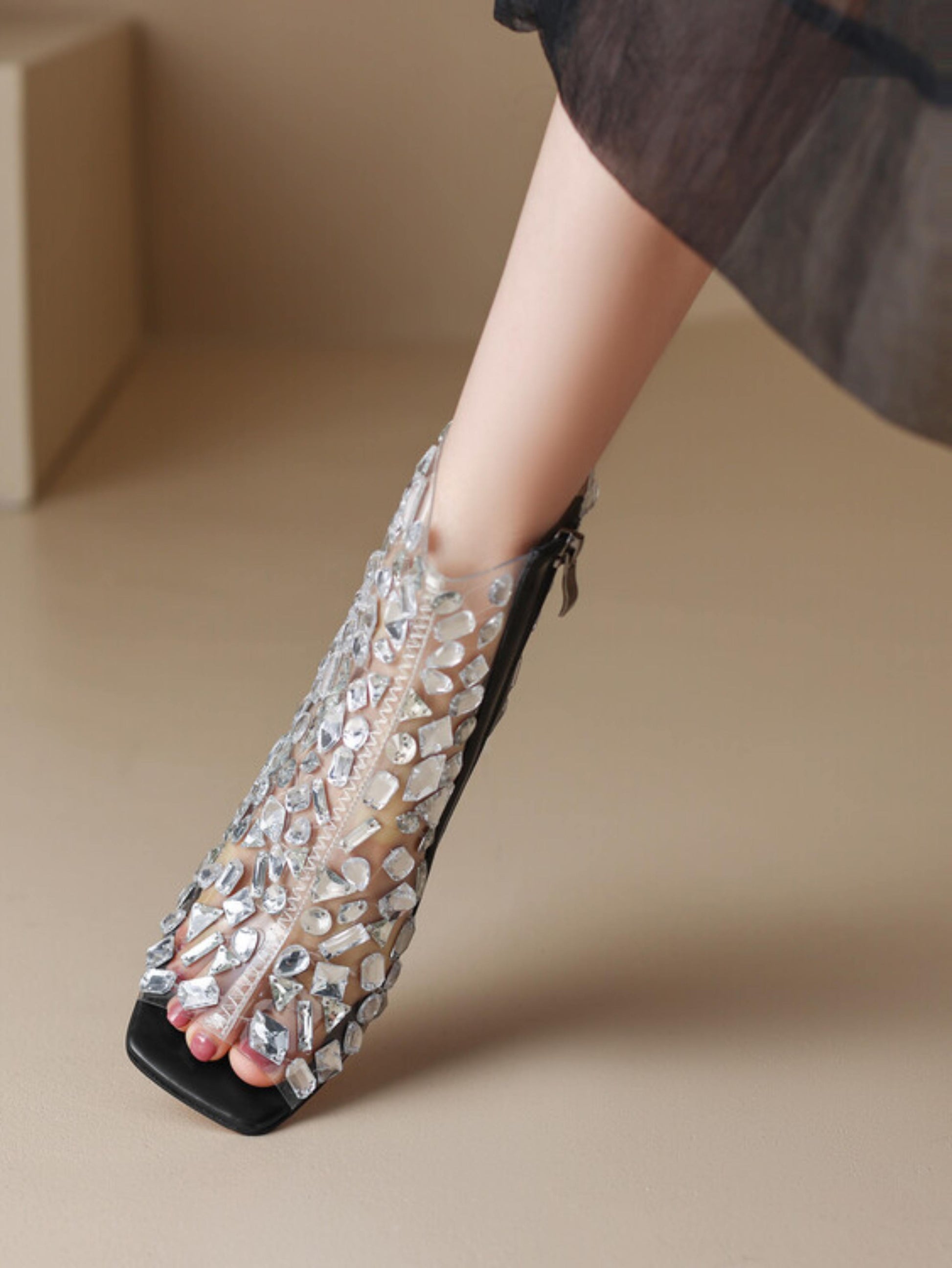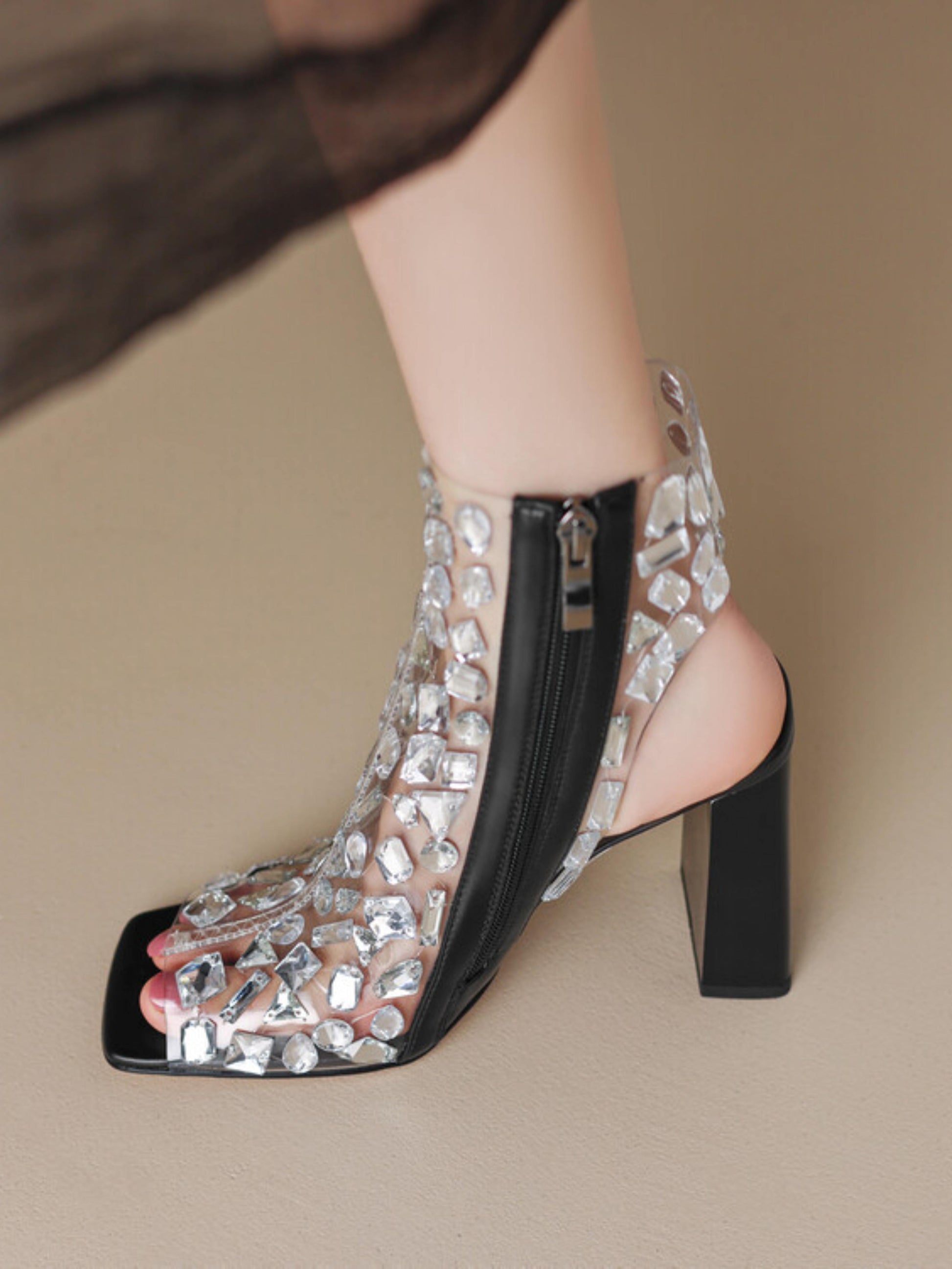 - Sandal Features: Geometric rhinestone accents, transparent upper, and chunky heel