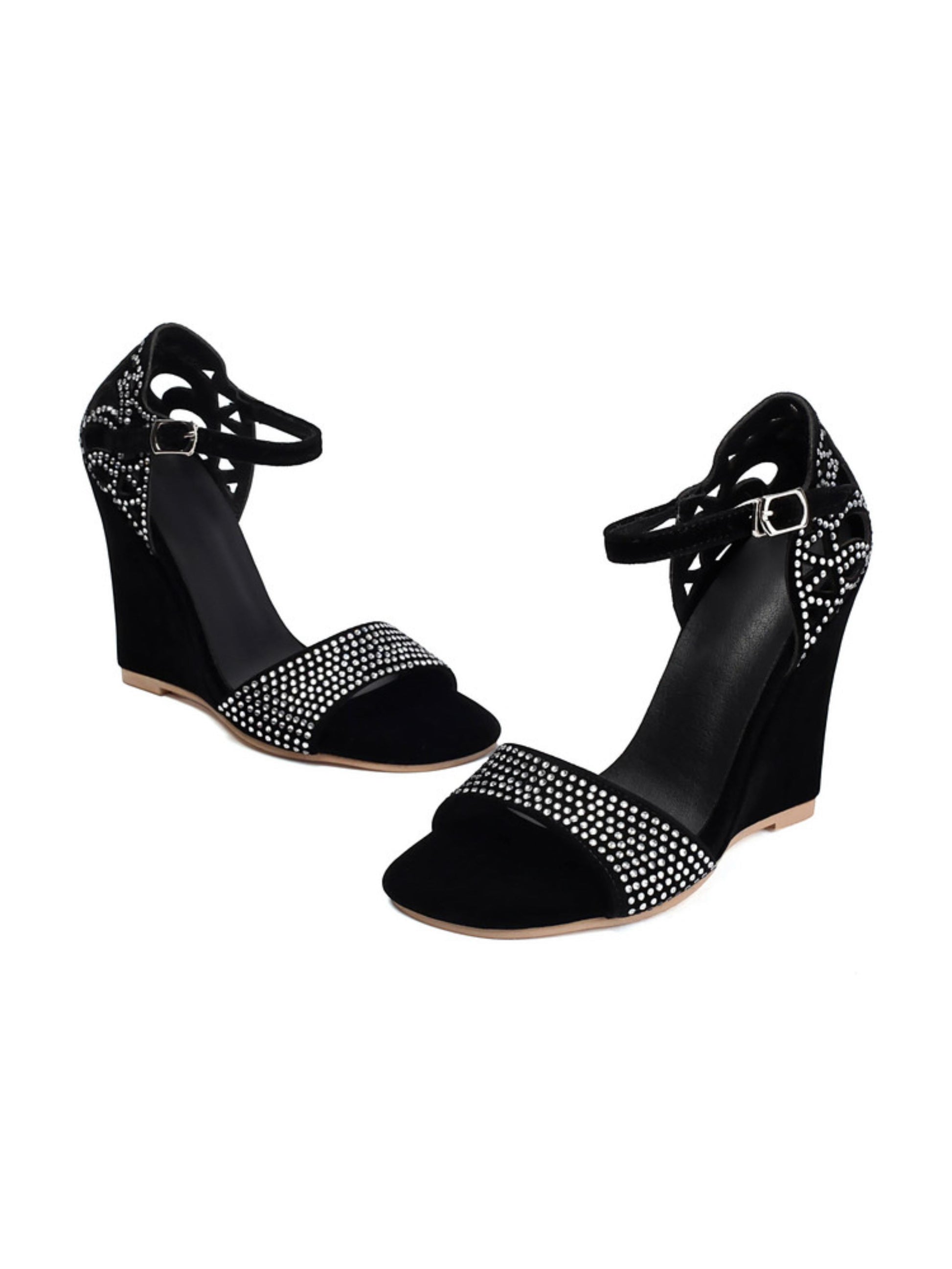 - Sandal Features: Rhinestone-embellished strap across the toes, open toe design for breathability, and wedge heel