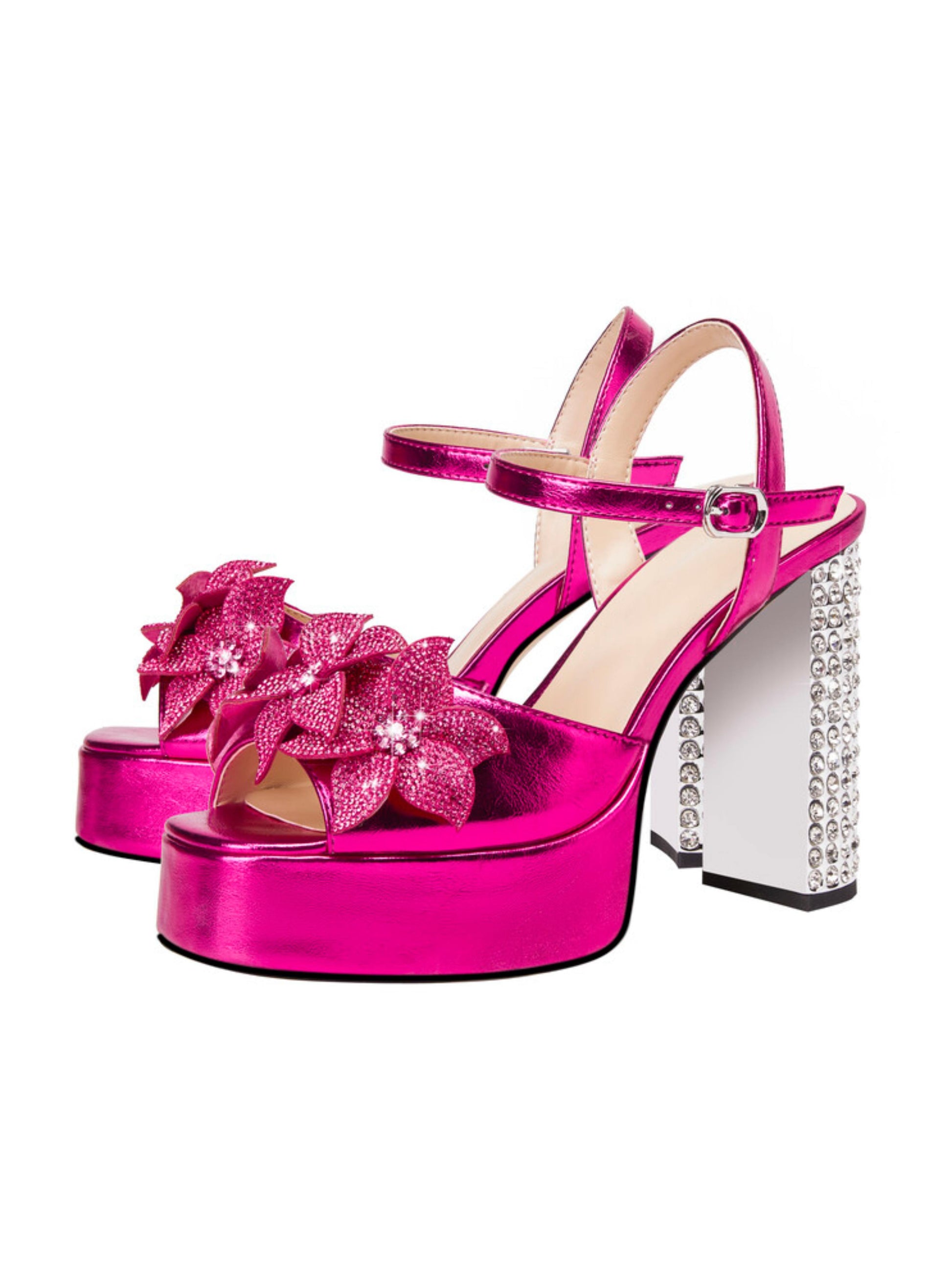 - Sandal Features: Large rhinestone-embellished floral appliqués on the toe strap, mirror-like block heel with rhinestone accents for extra sparkle, and ankle strap provides support