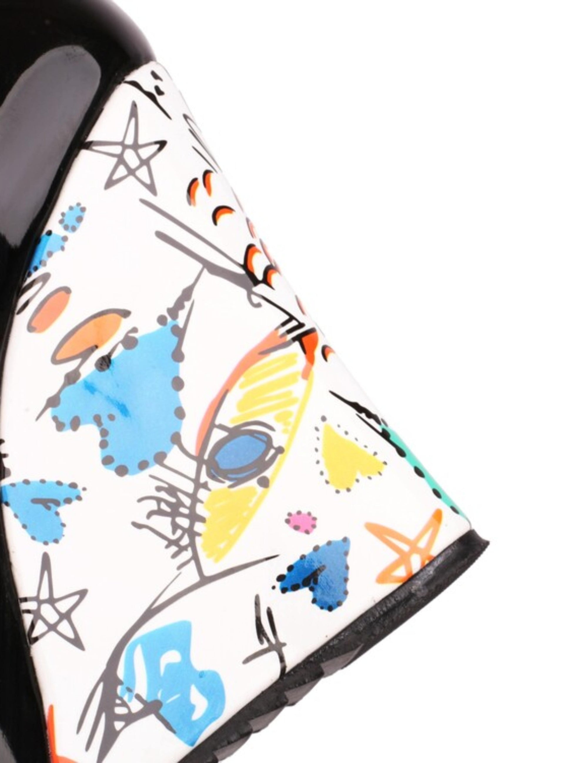 - Sandal Features: Colorful abstract print wedge, smooth glossy finish, and cushioned insole for comfort