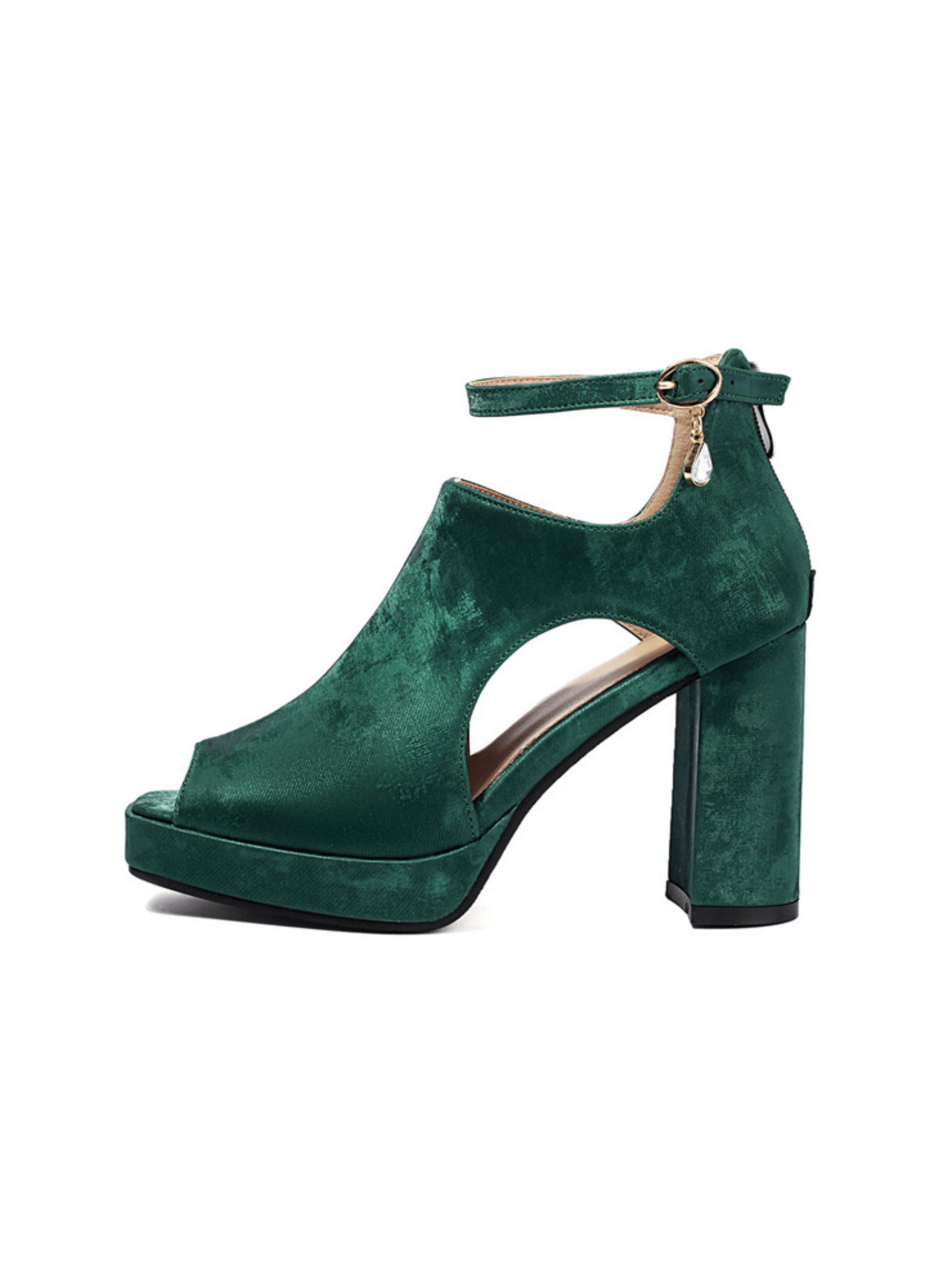 - Sandal Features: Cut-out side design, platform sole for added comfort, gold buckle detail with charm accent, adjustable ankle strap with buckle, and cushioned insole