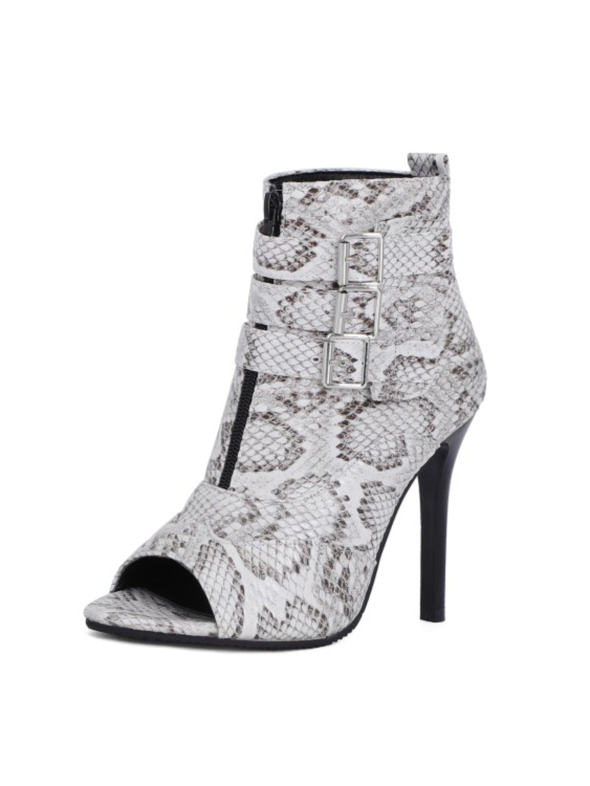 - Sandal Features: Fashion-forward peep-toe design, statement snakeskin texture for a bold fashion look, triple adjustable straps with metal buckles, front zipper closure for both style and ease of wear, and high stiletto heel for an elongating effect