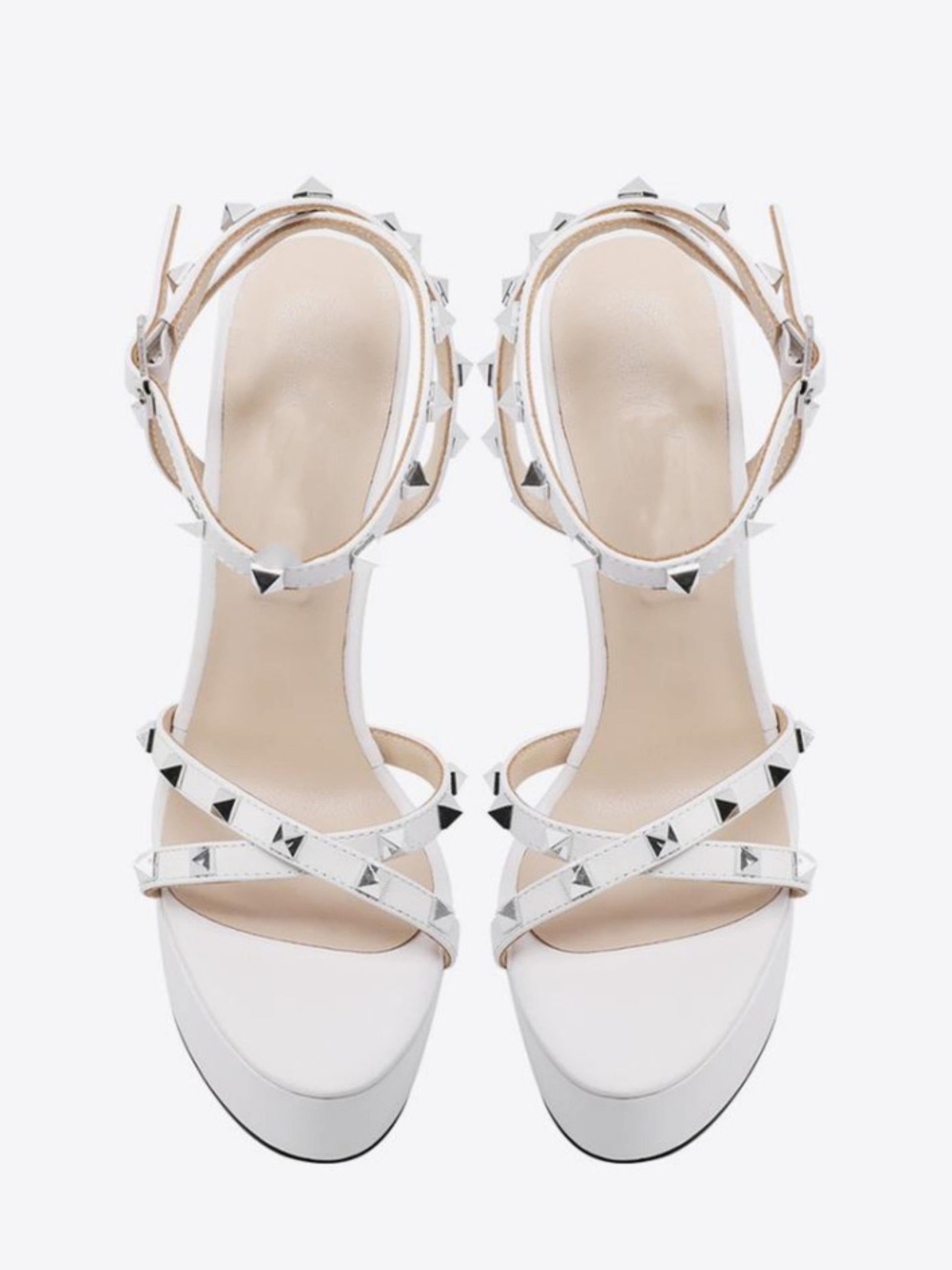 - Sandal Features: Thick platform sole for added height and comfort, adjustable ankle strap with buckle for secure fit, decorative silver pyramid studs along straps for edgy style, and wide front strap for stability